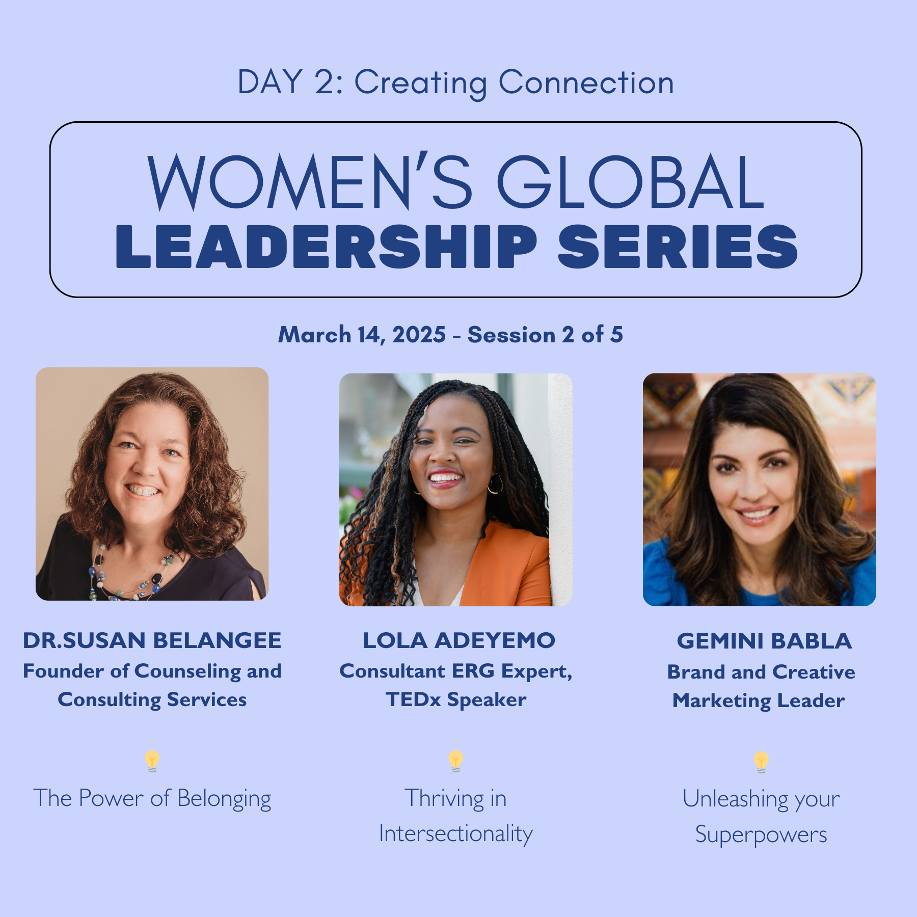 Belonging is a fundamental human need, and life tends to go well when we feel our presence and contributions matter. This session will explore how good leaders create safe spaces for others to feel connected, capable, and valued. You’ll identify how you pursue belonging and learn methods to create it for yourself and others.Dr. Susan Belangee is a professional consultant who specializes in Leveled Leadership(SM), assisting individuals, businesses, and organizations to gain the deeper insight required to create lasting success. She regularly presents and offers trainings in the US and internationally on mental health topics and leadership-related issues. Susan is excited to be involved with the 2025 Women's Empowerment Summit.